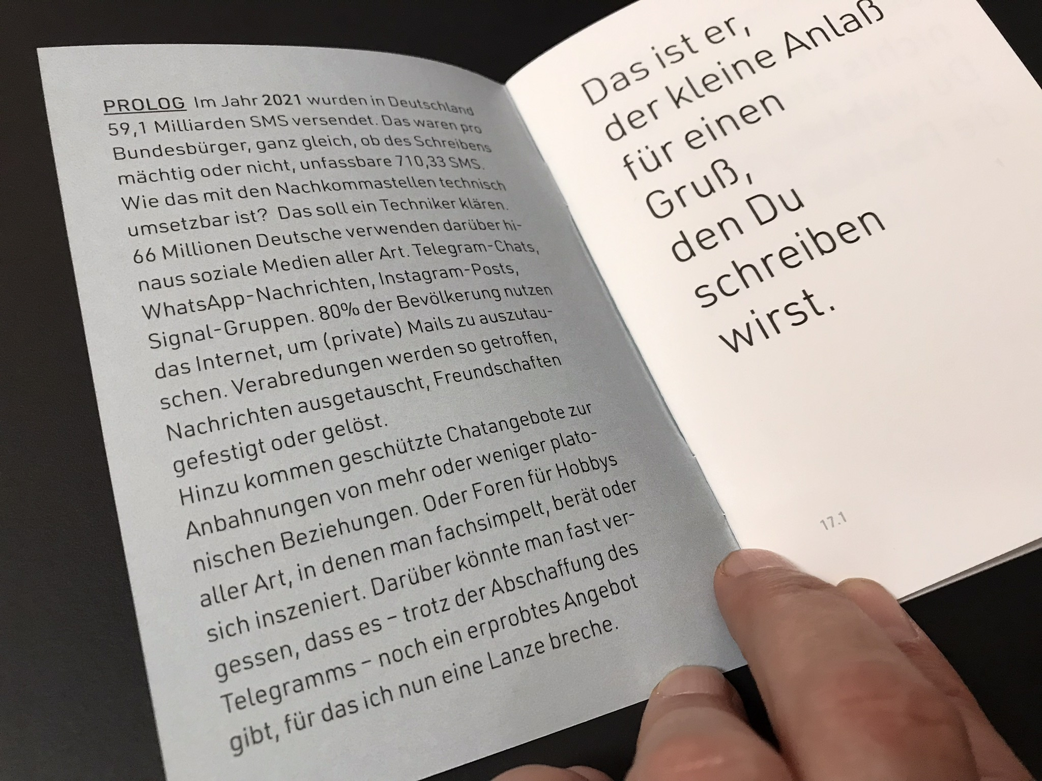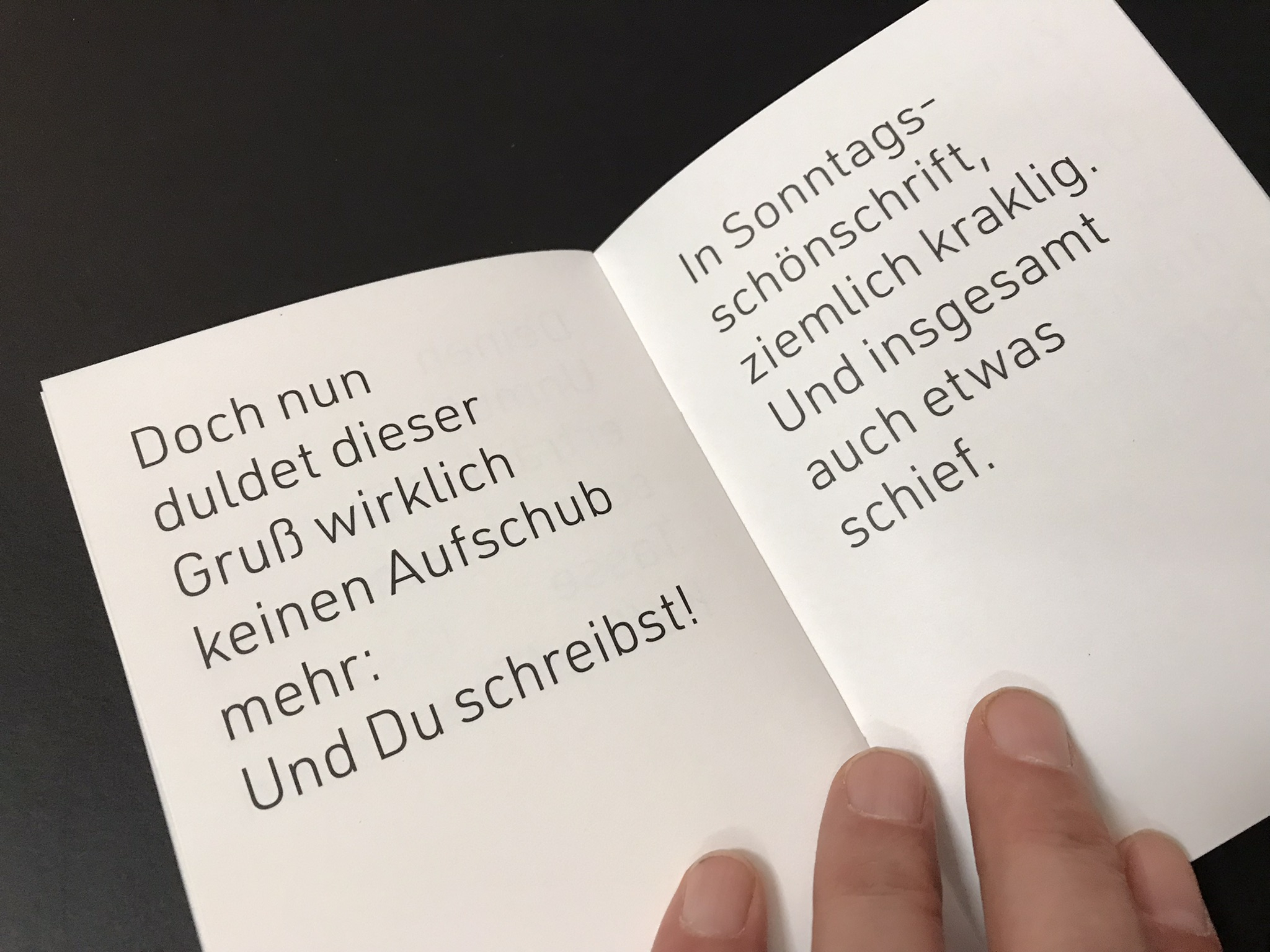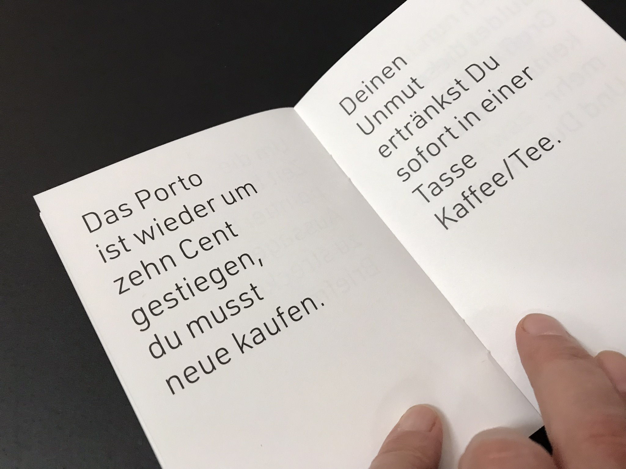 Ein kleines Heftchen, eine Anleitung zum Verfassen und Versenden in jeweils 17 Silben. Für den Fall, dass ihr alle nicht wisst, wie das geht. Also wie man eine Postkarte so ganz genau verfasst. Wie das ist, mit dem wenigen Platz auf der Rückseite klarzukommen. Oder wie sich das anfühlt, tatsächlich eine gehaltvolle Botschaft auf den Weg gebracht zu haben. Dieser Akt, zum Briefkasten zu gehen, die Klappe zu öffnen. In den dunklen Schlitz zu blicken, loszulassen. Zu hören, wie dieses kleine Stück Pappe innen landet. Das Klappern, wenn man den Kasten wieder schliesst. Die Ohnmacht, es jetzt nicht mehr rückgängig machen zu können. Darauf zu vertrauen, keinen Fehler gemacht zu haben. Dazu das schöne Gefühl, etwas Besonderes getan zu haben.