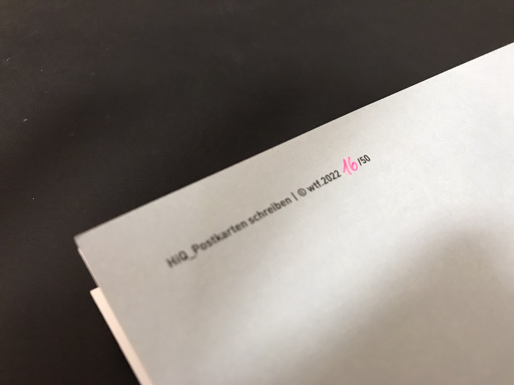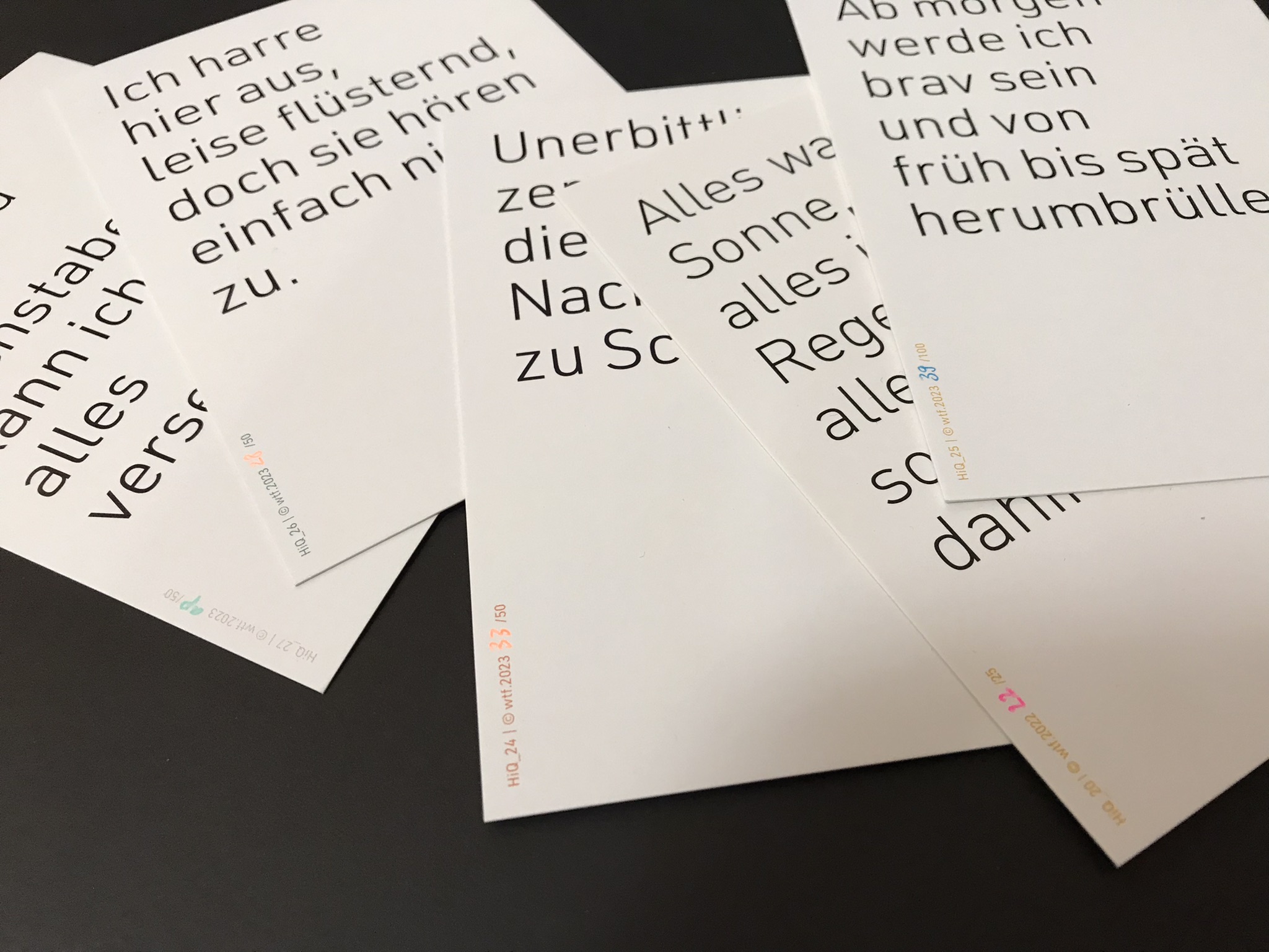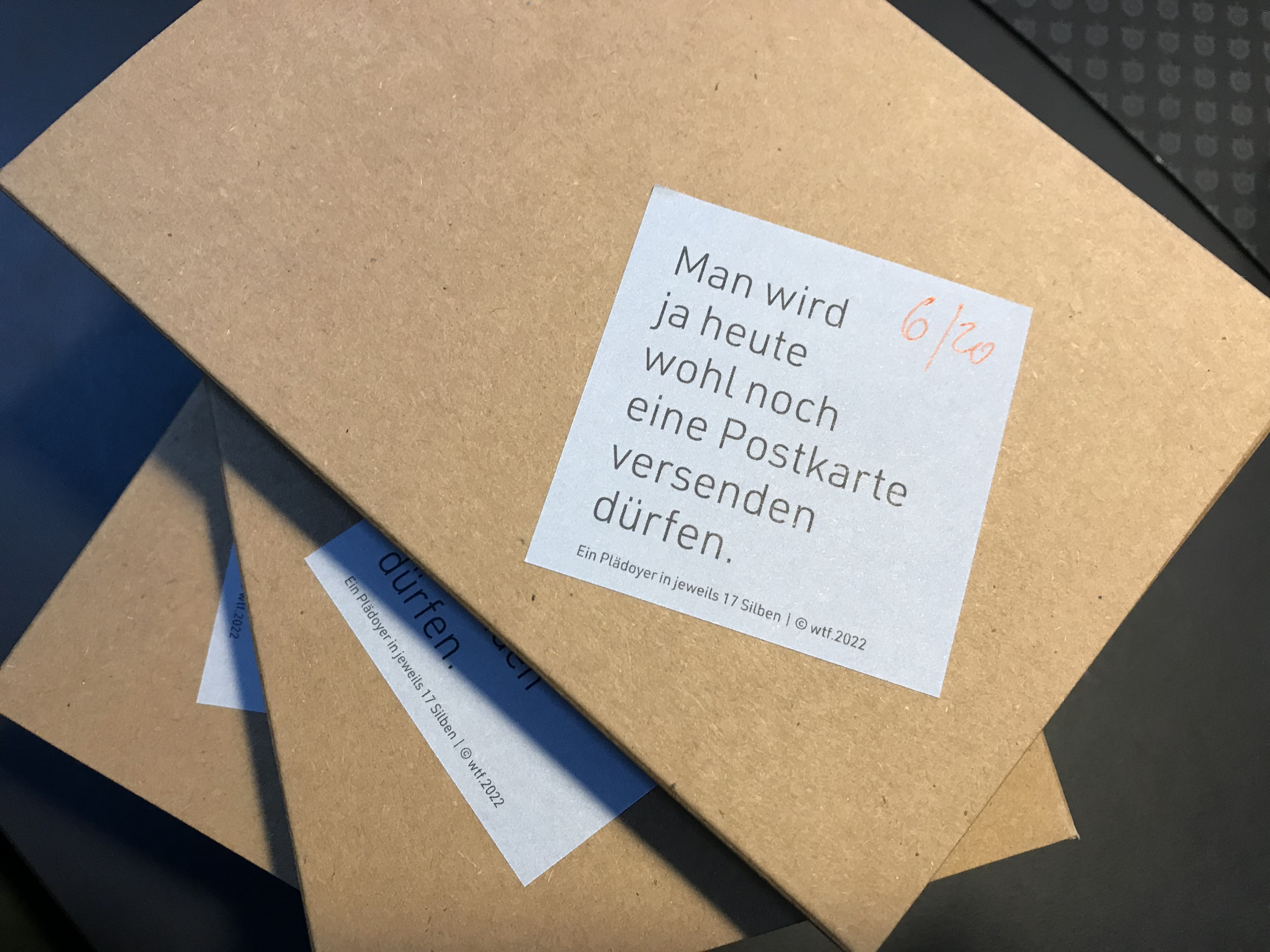 Was gut genug ist, findet den Weg auf eine Postkarte. Diese Postkarten sind eine Edition, mal 25, mal 50 oder 100 Stück – aber niemals zu viele. Ordentlich per Hand nummeriert, vorne Text, hinten blanko. Es geht nicht ums Geschäft.