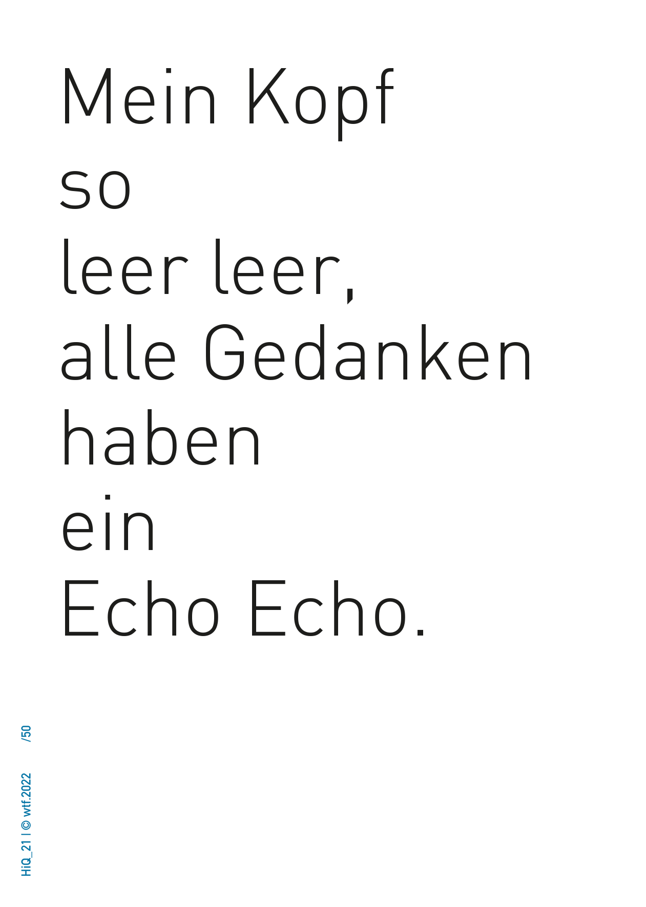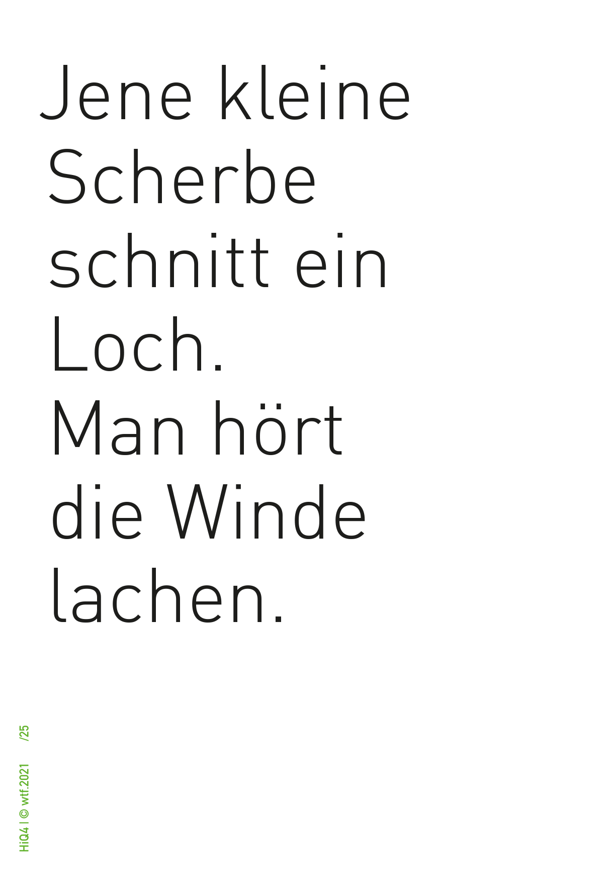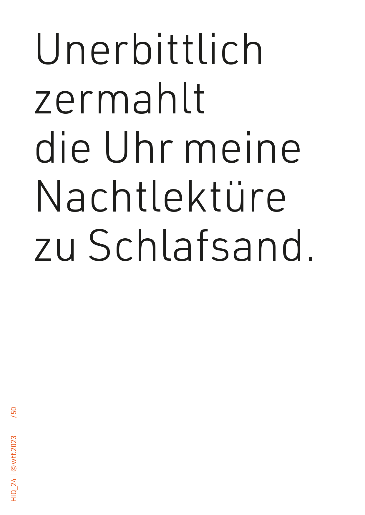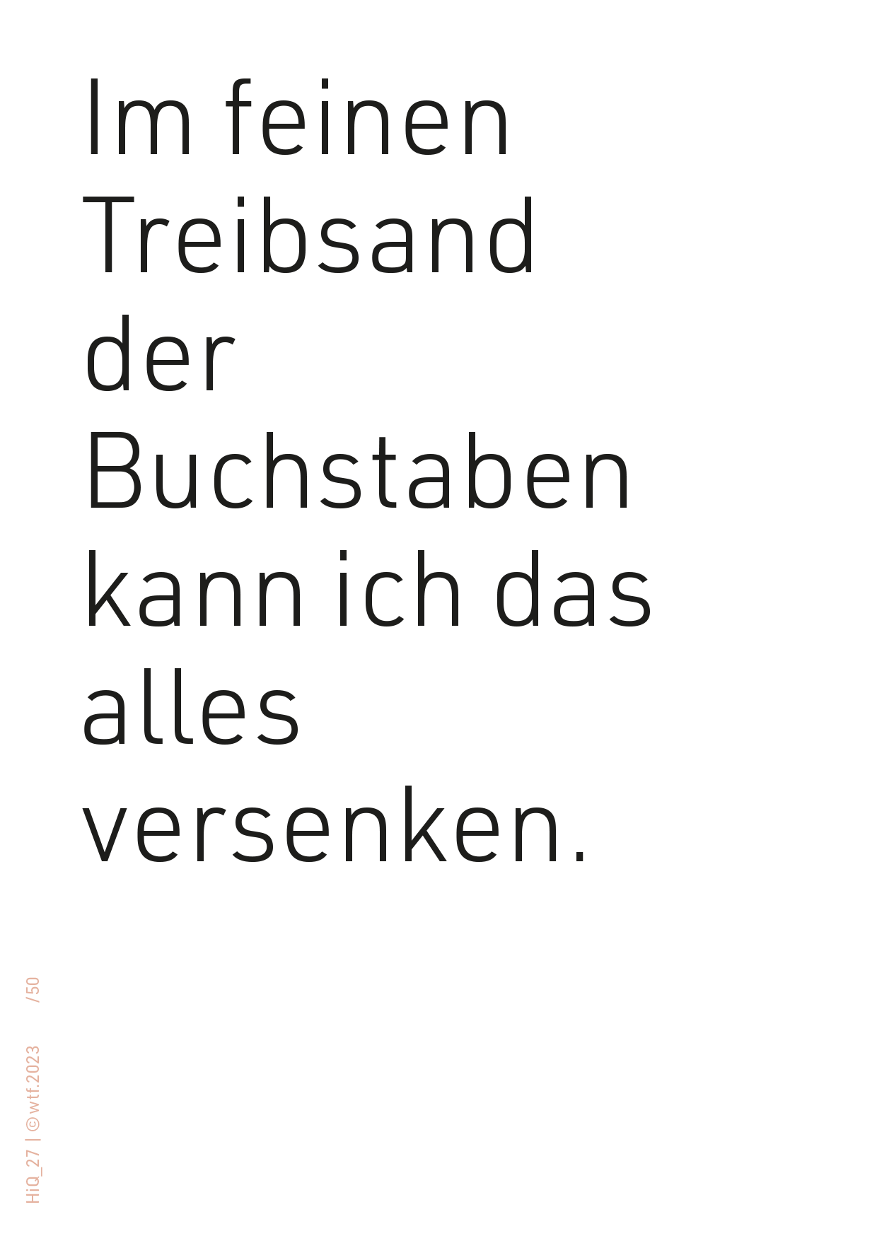 Ich schreibe den Gedanken nieder. Forme ihn, wende ihn, drehe ihn. Ich fräse ihn, modelliere ihn. Schraube ihn auseinander und wieder zusammen. Ich drehe den Silbenteig zu einer Spirale, dann zu einer Wurst. Ich rolle ihn aus. Presse ihn, bis alles Überflüssige herabgetropft ist.
